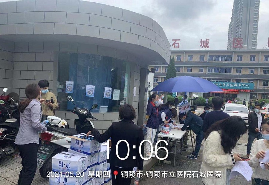 安徽城鄉(xiāng)置業(yè)集團(tuán)成立“愛(ài)心送水小隊(duì)”,針對(duì)銅陵市各疫苗接種點(diǎn),舉行送水活動(dòng)。2021年5月15日-5月20日,分別對(duì)銅陵石城路醫(yī)院接種點(diǎn)、銅官區(qū)文化館接種點(diǎn)、高速社區(qū)接種點(diǎn)、新中醫(yī)院接種點(diǎn)等為接種疫苗的市民、醫(yī)護(hù)工作者、志愿者送去礦泉水。